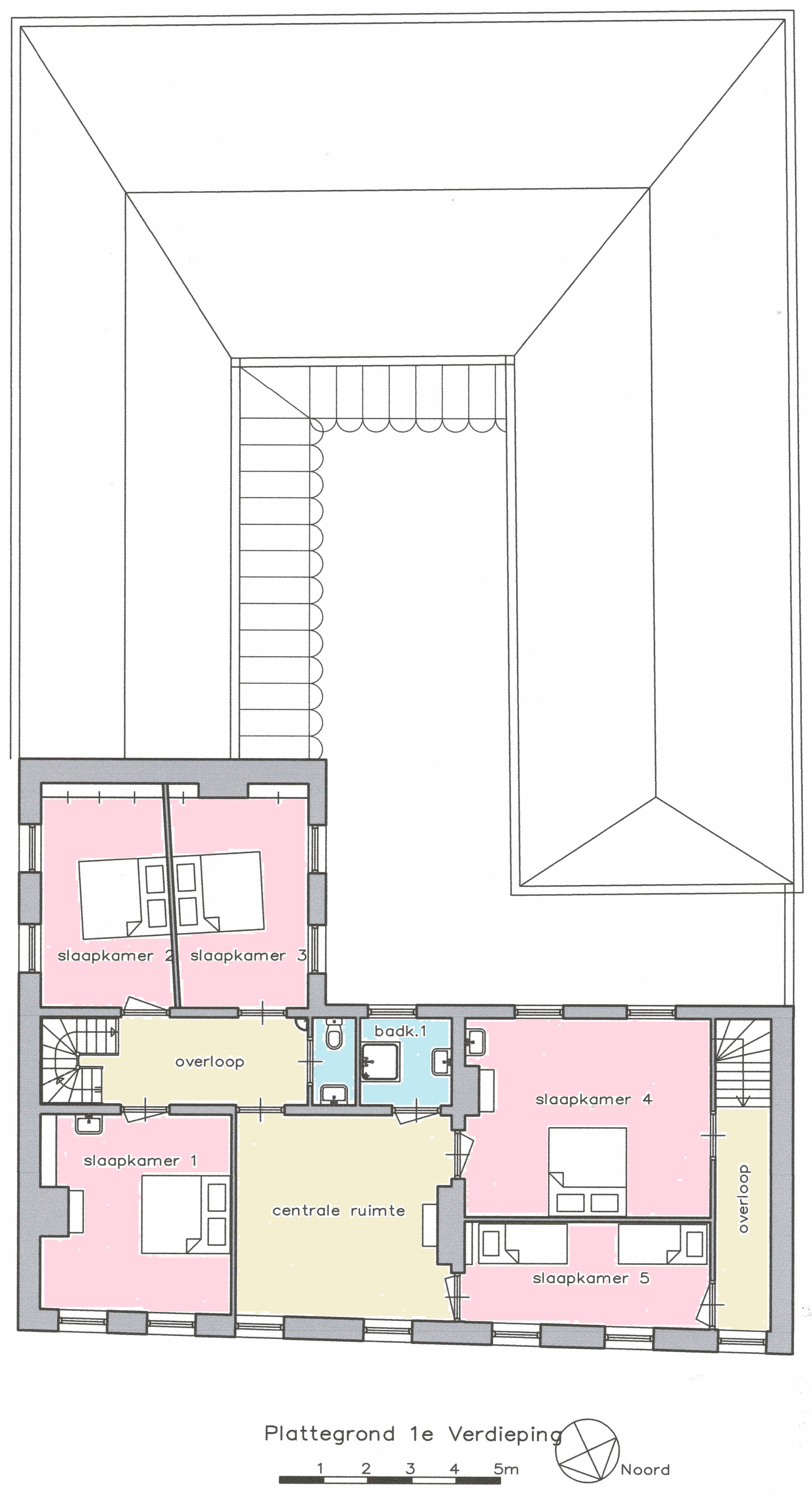 de eerste verdieping is bereikbaar met 2 trappen, vanuit nr 3 en nr 5